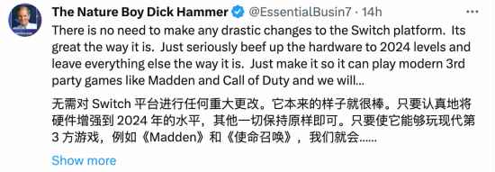 不少网友认为现在的设计已经够好了,它需要的是性能增强:“无需对Switch平台进行任何重大更改。它本来的样子就很棒。只需将硬件增强到2024年的水平,其他一切保持原样即可。让它能玩《COD》之类的现代第三方游戏,我们就会买账。”