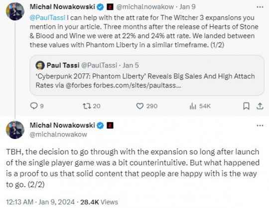 目前围绕这款游戏的热议主要来自《赛博朋克2077》资料片《往日之影》,该资料片已售出超500万份,战绩相当不错!近日CDPR联合首席执行官Michael Nowakowski声称,《往日之影》已获得商业成功,取得了与《巫师3》资料片类似的成功。 Nowakowski透露《往日之影》的购买率为23%,即购买了《赛博朋克2077》的玩家中有23%的人购买了这款资料片。而《巫师3》资料片《石之心》的购买率为22%,《血与酒》的购买率为24%。