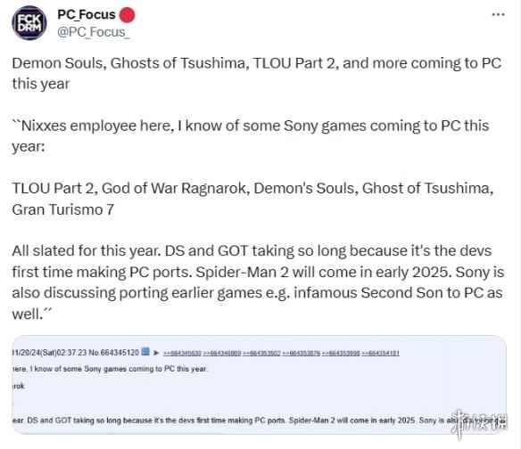 据推主PC_Focus透露,一位声称是 Nixxes Software的员工爆料,《对马岛之魂》《恶魔之魂重制版》《战神:诸神黄昏》《最后生还者2重制版》《GT赛车7》等多款索尼主机独占游戏都将在2024年内登陆PC平台(Steam),《漫威蜘蛛侠2》将在2025年初登陆PC,索尼也在内部讨论过将一些老游戏移植到PC平台,例如《声名狼藉:次子》。之所以《恶魔之魂》和《对马岛之魂》过了这么久才登陆PC,是因为Nixxes Software的开发者们第一次移植这样的游戏。遗憾的是没有《血源诅咒》上PC的消息。