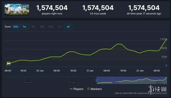 “究极缝合怪”《幻兽帕鲁》已于近日登陆了Steam抢先体验,这款游戏发售以后Steam爆火,在线人数连续创新高,今天上午我们报道了《幻兽帕鲁》Steam在线破129万的新闻,而目前,截止到发稿时为止,这款游戏的在线人数峰值再创新高,突破了157万人(1,574,504人)!