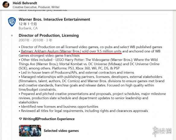 前华纳游戏制作总监 Heidi Behrendt(2007~2010任职) 在个人领英上透露,《蝙蝠侠:阿卡姆疯人院》销量已超过950万份。
