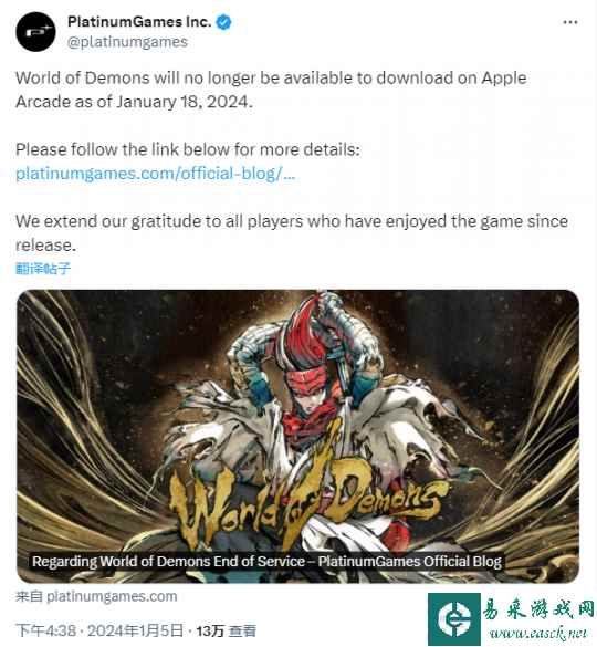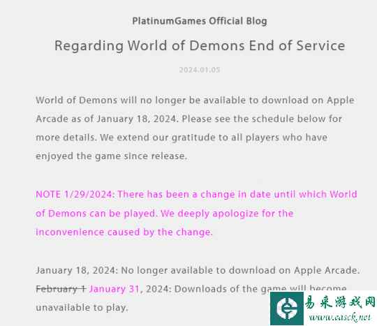 白金工作室为苹果开发的独占手游《百鬼魔道(World of Demons)》,曾在今年1月5日公开宣布游戏将于1月18日起不再提供下载服务,并于2月1日起彻底关服,游戏将无法游玩。