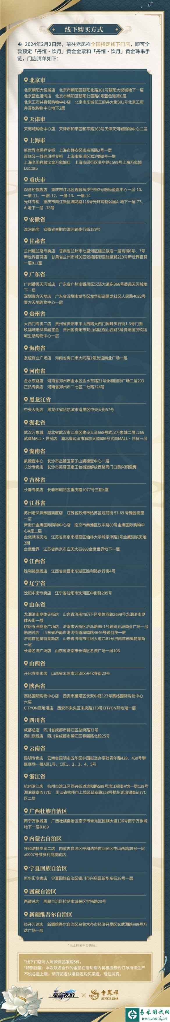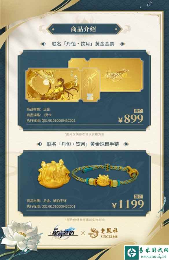 根据官方介绍,“丹恒·饮月”黄金金票材质为足金999,金重为1克。“丹恒·饮月”黄金串珠手链的材质为足金999,金重约为1.15克。两款联名金品均为一口价商品,还请开拓者按需购买,理性消费。 *线下预售门店每日接待人数有限,辛苦各位开拓者配合店内工作人员安排维持现场秩序,注意安全错峰出行~ *本次联名金品在活动期内不设总量上限,将根据开拓者预约订单数量持续生产,线下预定的到货时间请以各门店情况为准。
