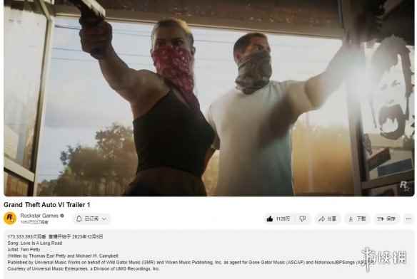 截止至本稿发出时,《GTA6》首个预告在油管的播放量已超过1.73亿,点赞数1128万,播放量和点赞数均是R星油管视频中最高的,播放量也已在1月15日时超过了《我的世界》首个预告,成为油管史上播放量第二高的游戏预告片(第一是《地铁跑酷》)。