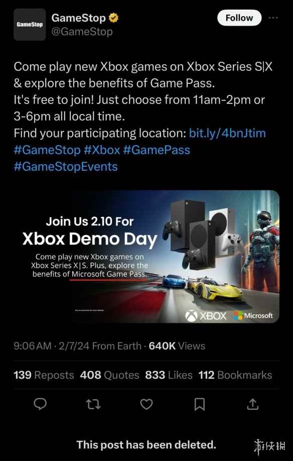 游戏零售商GameStop一条推文的宣传图中一反常态的将“Xbox Game Pass”改为了"Microsoft Game Pass",该推文现已被删除。由于微软已确定下周公布有关Xbox的未来愿景,GameStop的这一操作让多人认为是“XGP将改名为MGP”的提前泄露。