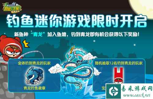 春风得意马蹄疾,新春到来人欢喜!除夕即将到来,《跑跑卡丁车》也在本次更新后,限时开启钓鱼迷你游戏!还有竞争排位赛第3章节第1赛季陪你度过新春!更有<2024春节口令红包>活动,等你来赢取龙年好礼哟~ 点击了解2月8日(本周)更新详情>>> https://popkart.tiancity.yzz.cn/homepage/event/2024/kr240208act/ 点击前往参与2024口令红包活动>>> https://evt08.tiancity.yzz.cn/kart/2351780/home/index.php 此外,在2月15日(下周)更新后,春节BINGO1+1也正式登场!更有温柔感性的“双鱼座宝宝”在新春后,首次与各位车手见面! 点击了解2月15日(下周)更新详情>>> https://popkart.tiancity.yzz.cn/homepage/event/2024/kr240215act/ 【2月8日更新 新春版本来袭】 本次更新后,在2月8日06:00至2月22日05:59期间,游戏内将限时开放“钓鱼迷你游戏”,新鱼种“青龙”加入鱼池,钓到“青龙”的车手,在活动结束后,可获得“青龙钓鱼徽章”~更有机会赢取“宝宝福运礼袋(1个)”的实物周边奖励哦!
