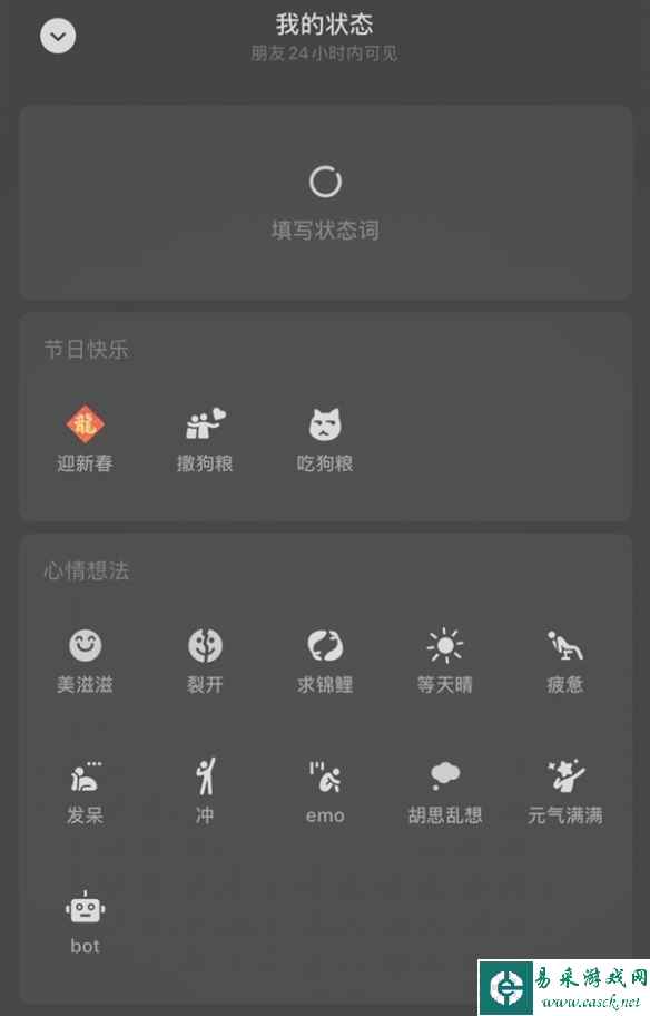 此外,微信个人中心页面的状态里,还上线了两个节日限定状态,分别是“撒狗粮”和“吃狗粮”。平时有切换状态习惯的你也可以随意切换限定状态。