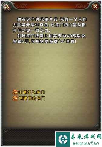 G键打开宗门界面选择想要加入的宗门点击申请即可加入。 二、创建宗门 当玩家等级达到40级时,并且包裹里有168000银两时,便可以寻找上官婉儿申请创建宗门。