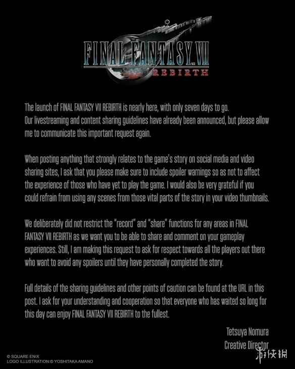 《最终幻想7:重生》即将在2月29日发售,官方昨晚发布了创意总监 野村哲也 的公开信,他呼吁玩家不要剧透,在分享游戏内容时带上能剧透警告,以免影响还未体验游戏的玩家。原文如下: