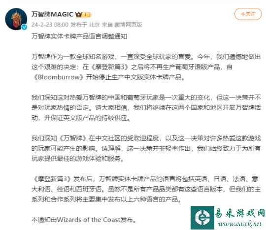 2月23日消息,官方威世智今日宣布,自《摩登新篇3》之后将不再生产葡萄牙语版产品,自《Bloomburrow》开始停止生产中文版实体卡牌产品。 完整公告如下: 万智牌实体卡牌产品语言调整通知 万智牌作为一款全球知名游戏,一直深受全球玩家的喜爱。今年,我们遗憾地做出这个艰难的决定:在《摩登新篇3》之后将不再生产葡萄牙语版产品,自《Bloomburrow》开始停止生产中文版实体卡牌产品。 我们深知这对热爱万智牌的中国和葡萄牙玩家是一次重大的变化,但这一决策并不是对玩家热情的否定。请大家相信,我们将继续在这两个国家和地区开展万智牌活动,并保证英文版产品的持续供应。 我们深知《万智牌》在中文社区的受欢迎程度,以及这一决策对许多热爱这款游戏的玩家可能产生的影响。请理解,这一决策并非轻率作出,我们始终致力于为所有玩家提供最佳的游戏体验和服务。 《摩登新篇3》发布后,万智牌实体卡牌产品的语言将包括英语、日语、法语、意大利语、德语和西班牙语。虽然不是所有产品品类都有这些语言版本,但我们的主系列和合作系列将主要集中发布以上六种语言的产品。
