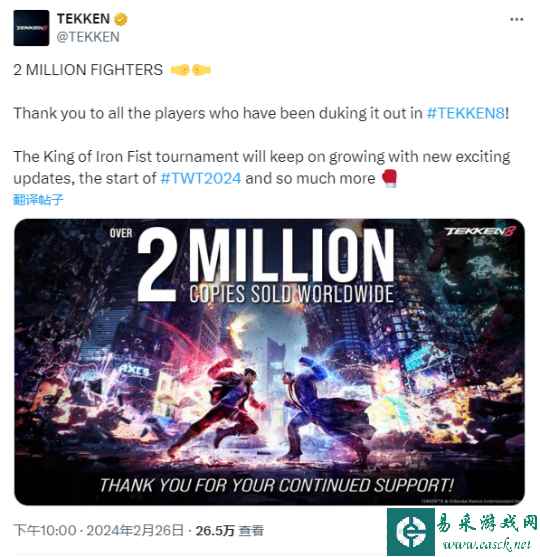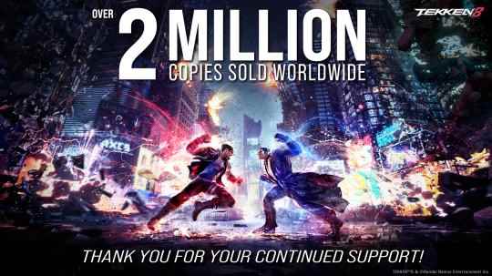 万代南梦宫3D格斗新作《铁拳8》正式发售后,在1个月的时间内销量超过200万份游戏,日前官方在推特发布了庆祝贺图。