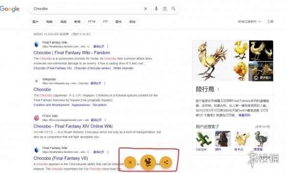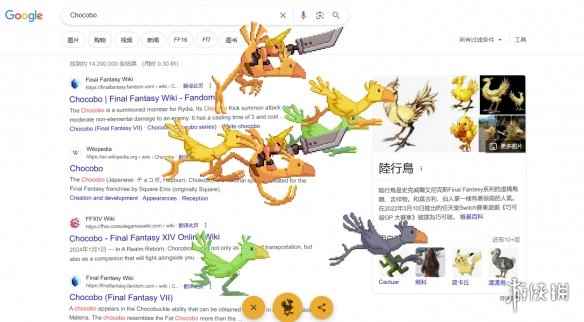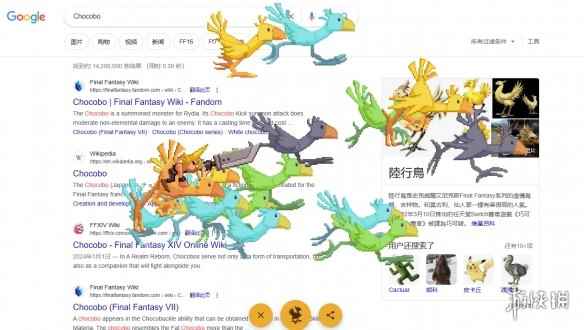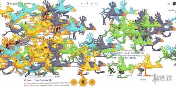 《最终幻想7:重生》今日正式发售!《最终幻想7:重生》也开启了与Google浏览器的联动,现在在Google浏览器上搜索“Chocobo”(陆行鸟)一词,浏览器下方就会出现陆行鸟的UI,点击即可互动,浏览器页面会有抖动效果,并有像素画风的多种颜色的陆行鸟在浏览器页面跑动,有时还会出现骑在陆行鸟上的克劳德,各位玩家赶紧去试一下吧。(可以连续点击,让你的网页窗口满是陆行鸟)