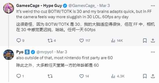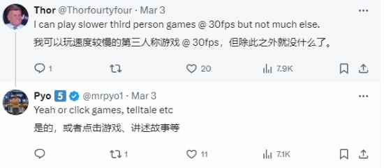 有网友回复表示,自己玩《荒野之息》《王国之泪》这两款30帧的游戏时,很快就适应了,但在《最终幻想》中,30帧会给人一种更迟钝的感觉。 也有网友称,玩第三人称的游戏可以接受30帧,其它的不行。帧数和分辨率一样,一旦碰到更好的,自己的标准就会提高。各位能接受30帧游戏吗?