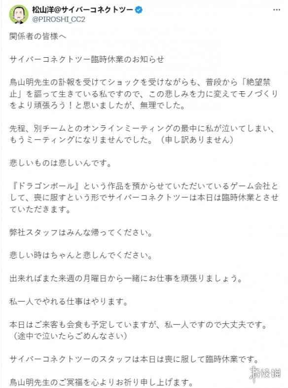 CyberConnect2的总裁松山洋表示,鸟山明老师去世的消息让我感到震惊,我一向倡导以“不绝望”为生,所以让我们把这种悲伤转化为力量,在制造上更加努力,但我做不到。 作为受托制作《龙珠》的游戏公司,CyberConnect2今天将暂时关闭,以示哀悼,如果您感到悲伤,请适当哀悼。如果可以的话,下周一开始我们再一起工作吧。我们衷心祈祷鸟山明老师安息。