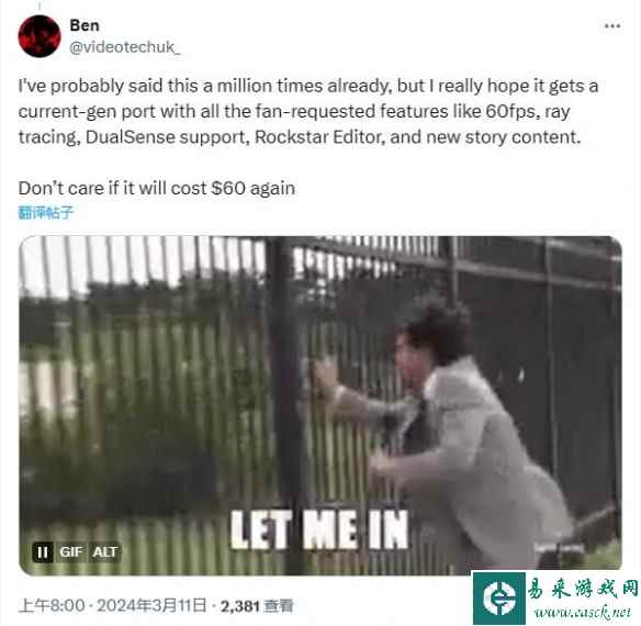 Ben重申,他非常希望《荒野大镖客2》能发布本世代主机版本(PS5和Xbox Series)。新增60帧、光线追踪、DualSense手柄适配、Rockstar编辑器和故事内容。同时他并不在乎是否会再花费60美元购买复刻版游戏。