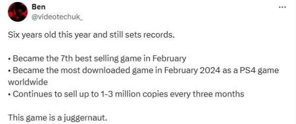 R星铁粉、知名游戏推主Ben今日发文,称《荒野大镖客:救赎2》虽然已经六周年,但仍像主宰般创造纪录:2月畅销游戏第七名、2月全球下载次数最多的PS4游戏、每个季度都能再卖至少一百万份。