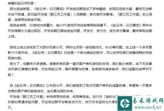 而在近期,《赵云传:云汉腾龙》的开发团队又被曝出了新危机。由于资金链断裂,且寻求收购、融资无果后,开发团队醉江月工作室正式宣告解散,有关新内容的开发也就此暂停。游戏本身虽然还会由发行方继续运营,但更新恐怕指望不上了。