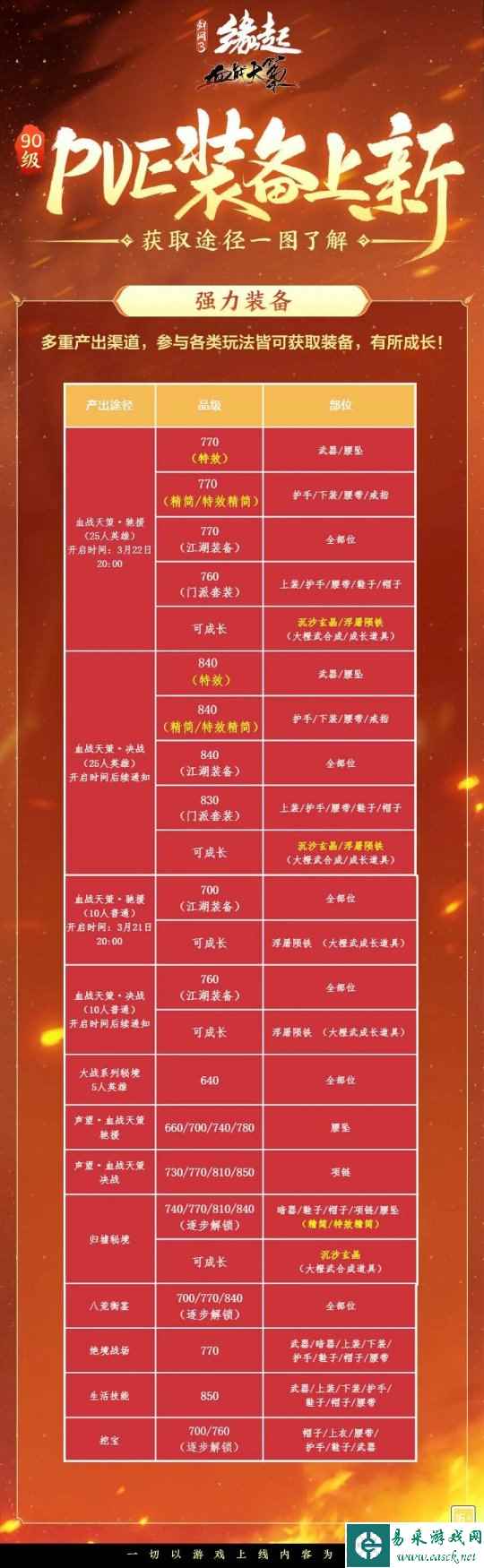 《剑网3缘起》全新资料片「血战天策」版本即将于3月21日公测。不仅有装备更新,更有特色活动!快来一起看看吧。 装备获取途径一图了解 闯荡江湖,皆得成长!剑网3缘起新资料片「血战天策」 定档3月21日!装备产出渠道拓宽,参与各类玩法都将有所成长! - 英雄血战天策·驰援3月22日开启 - 更多装备获取渠道,角色养成更自由! - 新资料片「血战天策」将于初期逐步开放780品装备拍卖,850品装备将于赛季中期开放拍卖。