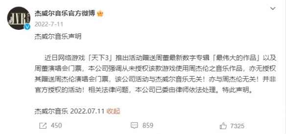 据媒体消息称,此前网易旗下的《天下3》游戏推出了自费抽奖活动,赠送周杰伦的数字专辑等福利给玩家,但周杰伦方面坚称该活动并未得到其授权,与他本人无关,随后便对网易提起了法律诉讼。