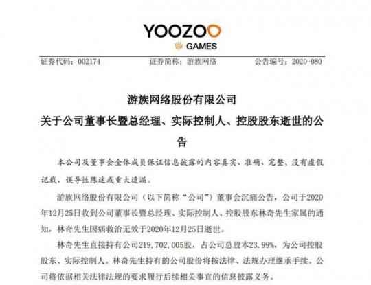 这则消息当时便引发了外界广泛关注,直到2020年12月25日晚,游族网络正式发布公告称:公司收到公司董事长暨总经理、实际控制人、控股股东林奇家属的通知,林奇因病救治无效于2020年12月25日去世。
