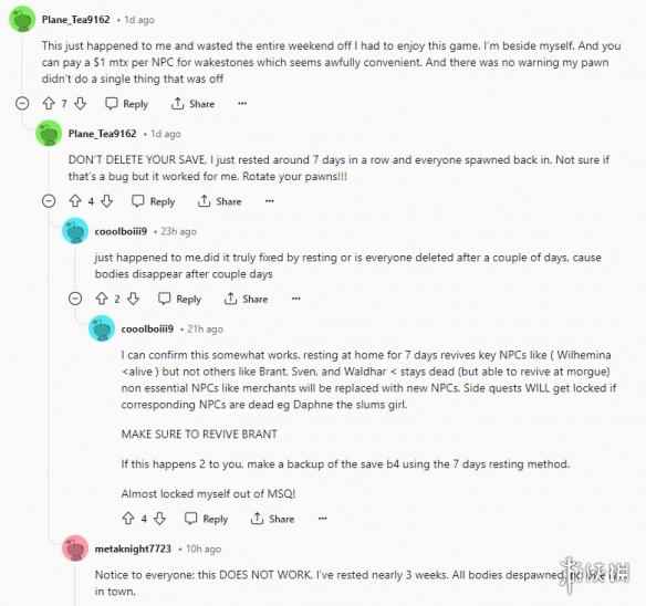 网友“Abdulrahman_AAA”表示自己太崩溃了,自己的存档基本已经变成了死档,因为他没有足够的复活石来复活这些NPC。 在回帖中有不少玩家表示自己也遇到了这个问题,还有人发现了解决办法——继续在旅店中休息1周左右,所有的NPC就会重新出现。但也有玩家休息了3周都无法复活NPC,因此有玩家通过观察发现,一些关键NPC会直接复活,例如商人等非必要NPC则会被取代,其余的NPC需要玩家去太平间进行标记后才能复活。