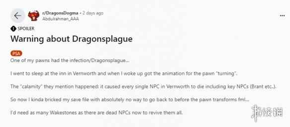 根据《龙之信条2》官方的介绍,“追随者系统”是玩家将会赋予游戏中的非玩家角色个性,人工智能则会驱动这些角色,与他们一起战斗就像多人游戏一样。 不过这套系统的运作方式有些超过了卡普空和玩家的预期。 最近有玩家在红迪论坛上分享了自己的遭遇:当他的角色在旅馆休息后醒来,发行他的追随者“转变”成了一条影龙并杀死了城镇中的每一位NPC角色,这其中就包括一些关键NPC。