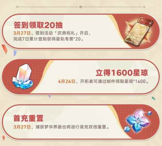 周年庆典启程,线上线下福利持续放送 除以上新地图场景及角色的情报外,本次更新也将迎来《崩坏:星穹铁道》一周年生日,开拓者可通过签到的形式获得星轨专票*20,还可在周年庆4月26日当天获得星琼*1600和燃料*10的福利,捕获梦华界面将进行首充双倍重置;新玩家首次体验游戏,最高可获得总计100抽的福利,老玩家回归参与回归活动,最高可获得20抽+2800星琼奖励! 此外,开拓者挑战「模拟宇宙」和「侵蚀隧洞」时,可获得三倍奖励;还有周年活动小游戏「星间旅行」上线,各位开拓者可借此回顾这一年留下的冒险足迹。
