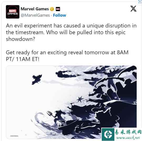 漫威即将发布一款新游戏。其在推特上发布消息,确认将于 3 月 27 日太平洋时间上午 8 点(北京时间 3 月 27 日晚 11 点)正式公布。 推文内容为:“一个邪恶的实验对时间流造成了独特的破坏。谁将被卷入这场史诗般的对决?”此外,还展示了似乎是游戏美术作品的内容。