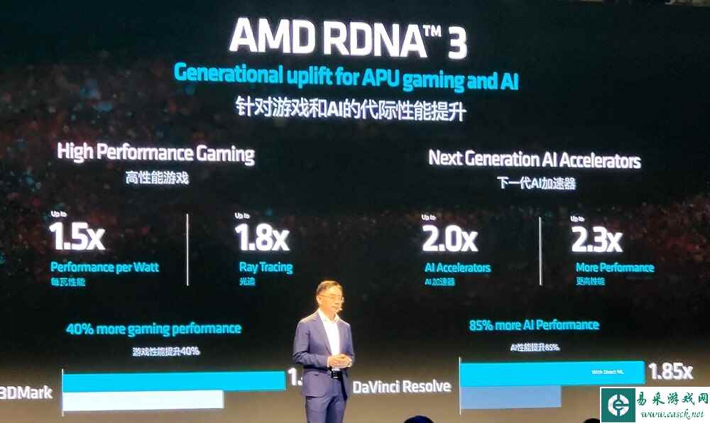在硬件方面:AMD 锐龙8040系列处理器基于AMD RDNA 3架构的Radeon显卡和由AMD XDNA架构打造的AMD Ryzen AI,拥有了比AMD第一代AI PC处理器高60%的AI TOPS夸张性能。在AI性能之外,还有着强大的隐私和安全功能,以及高能效以及低成本优势。AMD 锐龙 8000G系列,则是基于Zen 4架构打造,最高8核心16线程设计。其内置的Radeon 700M集成显卡,号称足以应对3A大作,帮你告别独显。RDNA3+——即将发布的新的一代笔记本APU处理器“Strix Point”,游戏性能提升最多40%,光追性能提升最多80%,能效提升最多50%,AI性能提升最多1.3倍。