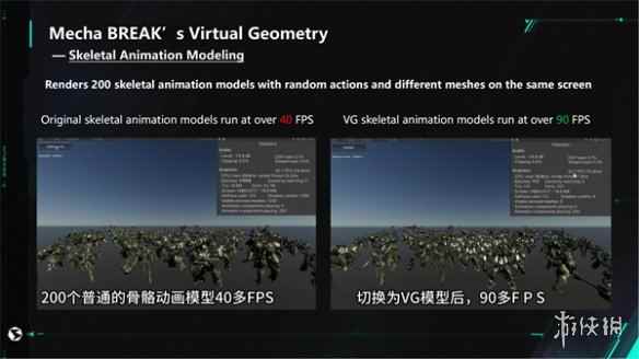 (VG使单场景承受面数变高) 此外,黄锦寿还在GDC上演示了VG在《解限机》的具体运用。传统的 GPU Skinning,需要把动作烘培到贴图上,但是这样操作,动作融合、IK、RIG动作融合,都没有办法使用。《解限机》对动作的表现力要求比较高,所以使用了 IK Rig 动作融合这些功能。为了解决此问题,制作团队决定在这些动作系统完成骨骼矩阵运算后,再把数据上传到 GPU 显存中,在 GPU 里面做蒙皮动画计算。最后通过 VG 一次DrawCall 就可以全部渲染到屏幕上,实现不同种类不同动作的机甲单个Drawcall一次完成渲染。