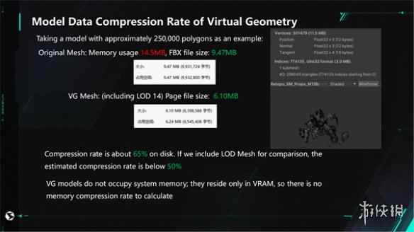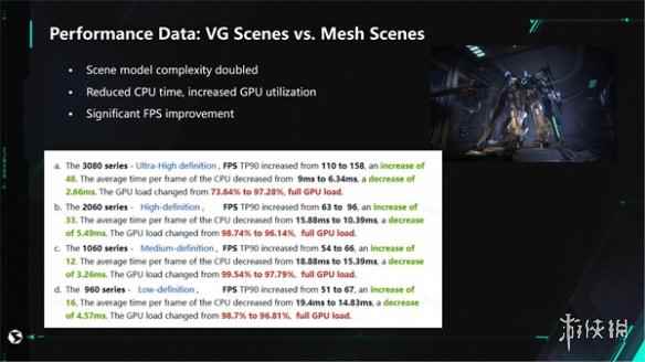 (VG场景与普通场景性能数据对比) VG是新引擎的全新特性,可以媲美目前最先进的商业引擎的虚拟多边形效果。这场关于西山居《解限机》VG应用的分享引起了在场国外开发者的浓厚兴趣,他们在提问环节纷纷举手发言,就自己关心的问题向专家请教,他们的踊跃提问不仅促进了行业内的交流与进步,也为VG技术应用于游戏,以解决行业难题提供了宝贵的启示和动力。