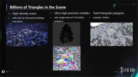 (基于VG可实现的交互植被) 并且,VG使单场景的 triangle 数量大幅提高,可以突破以前的数量限制,常规的模型三角面数量不再是渲染效率的瓶。在GDC上,黄锦寿进行场景演示,展示了VG的渲染性能。在一个十分复杂的场景中,植被加上建筑总面数可能超过了惊人的10亿个三角形面片,甚至有可能达到数十亿之多。但是由于有VG的技术,团队只需制作出高精度的模型,就可以在面数上稍微放松一点,使美术可以有更大的发挥空间。