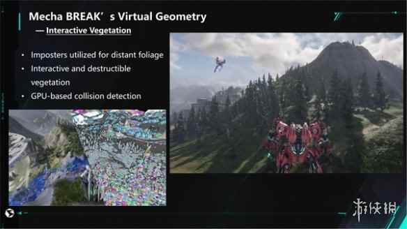(完整的渲染管线流程都在GPU中完成) 在分享中,黄锦寿还提到,游戏的植被系统是为项目专门定制化开发,让植被系统支持VG,通过VG渲染游戏里所有的树和草,并且还支持交互。并且,植被系统支持Imposter,从近处看是实体模型的树,远处看是简单几个面片的Imposter,这些植被也支持可破环、交互,这些碰撞检测都通过GPU来计算。在游戏实际应用中,是允许多名玩家同时发射子弹并破坏场景中的植被。由于子弹数量庞大,计算碰撞检测的处理量非常高。为了解决这个问题,制作团队充分利用了GPU的并行计算能力来进行高效的碰撞检测,使能够支持大量子弹同时进行精确的碰撞检测。