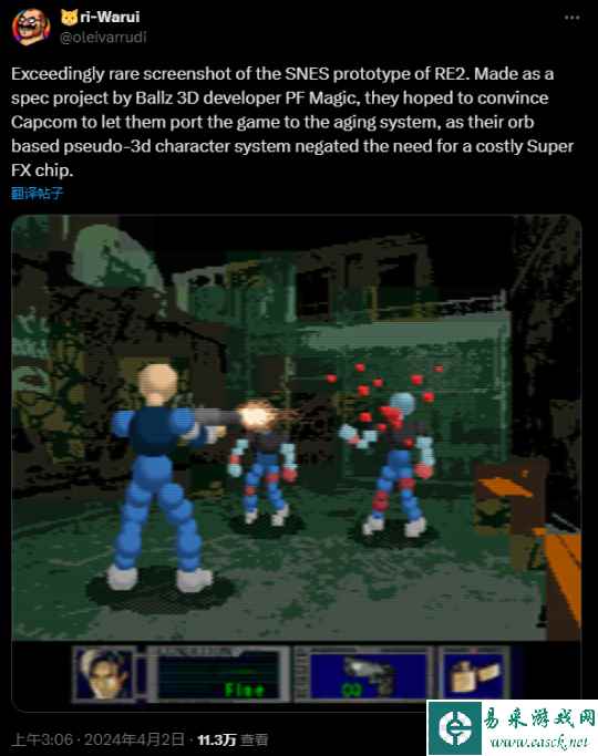 4月1日,不少大忽悠新闻冒出来,其中大部分明显的是笑话,不过其中也有不少难辨真伪的,有外媒曝出卡普空经典名作《生化危机2》居然有高度疑似SFC版,诡异玩法有模有样。 ![]() ·据悉,本作是由PF.Magic开发的,原型就是致敬卡普空1998年的经典名作《生化危机2》,不过玩法改变了,角色也变成了“米其林轮胎”减肥版,由于SFC主机的机能限制,看上去很是粗劣的3D效果战斗。 ·鉴于该款游戏曝出的特殊时间,本作的真伪尚有存疑,目前暂时没有权威机构之处本作是否真实存在。 ![]() |