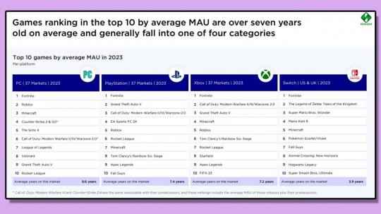 近日据市场调查机构Newzoo报告显示,大部分玩家仍然把大部分时间花在老游戏上。2023年他们花在老游戏上的时间约占总游戏时间的60%。 报告显示,PC和主机市场的增量提高了2%,收入达到935亿美元。不过大多数玩家将游戏时间花在了老游戏上,报告调查了全球37个国家和地区,发现2023年玩家60%的游戏时间花费在六年前或更老的游戏上,而这些游戏通常是即时服务在线多人游戏。 2023年在PC、PlayStation和Xbox平台上,月活跃数量前十的游戏是《堡垒之夜》《Roblox》《我的世界》《使命召唤》《给他爱5》《火箭联盟》等。《堡垒之夜》是所有平台上最受欢迎的游戏,《彩虹六号:围攻》在PlayStation和Xbox上更受欢迎,《给他爱5》销量接近2亿,也在所有平台榜单中名列前茅。