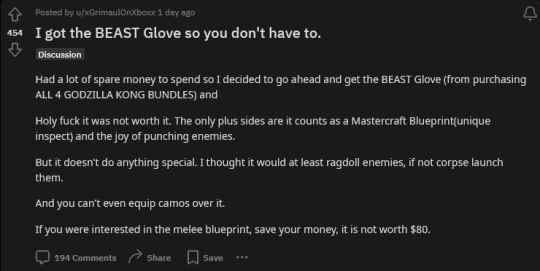 一些花了 80 美元的玩家在社交媒体上表达了自己的不满,表示作为一个近战武器,它没有任何独特功能,而且还不允许玩家装备自己的武器迷彩,这个价格非常的不值得。 玩家 xGrimaulOnXboxx 在论坛上的帖子中写道:“我买了 B.E.A.S.T. 手套,所以你们不用买它。唯一的优点是它算作大师蓝图,以及殴打敌人很有乐趣。但它没有任何独特的功能。我原一位它至少能让敌人有布娃娃效果,至少能让他们的尸体被击飞。你甚至不能在它上面装备迷彩。”