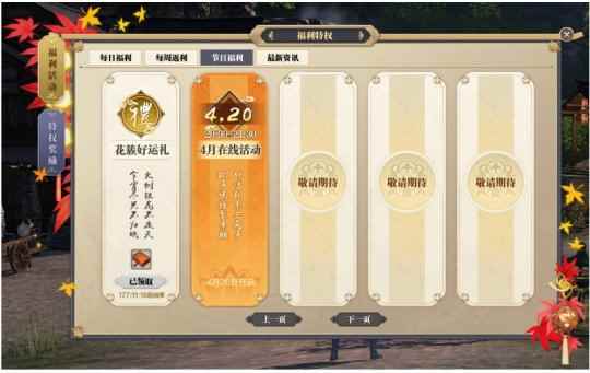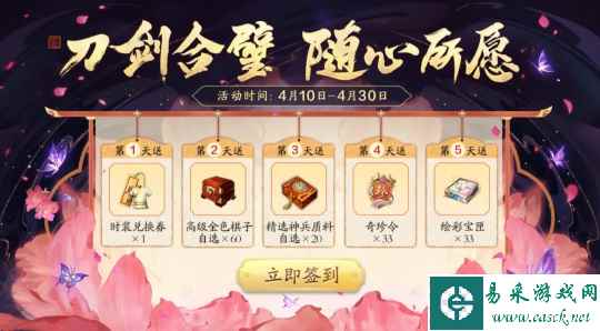 *春和景明,最适闲趣* 但喜二分春色到,百花生日是今朝。花朝盛会,各种闲趣活动应接不暇!少侠们可在开封清溪曲水流觞、笑道人处求签祈福、与幽谷七梅一起放飞花灯,在荆湖平原体验竹马跳……完成节日活动,即可获得佳节令、精品随机琅纹宝箱、周享兑换券等海量成长道具奖励。 盛春四月?在线领礼 4月20日20:30-21:30期间,少侠上线即可领取4月在线礼包“春和景明在线礼”。 开启即可获得碎银、周享兑换券、奇珍令、铸神令·精工材料自选、随机减负令礼盒、彩纫之匣、随机经纬宝箱。更有机会获得随心染匣、金色天地1级琅纹自选、金色混沌1级琅纹自选、陨焰之石、绝智琉璃魄、金句材料自选拍卖礼盒等稀有奖励! 温馨提示:非活动时间内,将无法领取在线礼包哦~