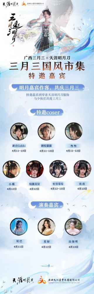 祝少侠甲辰年龙行大运,更愿"流浪"在外的文物早日回家! 刀哥再次提醒少侠:率真开朗的美乐蒂和可爱帅气的酷洛米即将结束八荒的奇妙之旅,离开刀刀江湖啦。天刀x三丽鸥家族系列联动内容:浮光·美乐蒂、莓果甜心礼盒、同心装饰:美乐蒂主题贴纸与同心手账封面等产品将于4月12日在同心商店下架。浮光·酷洛米、酷酷甜心礼盒、同心装饰:酷洛米主题贴纸与同心手账封面将于6月8日在同心商店下架。喜爱的少侠请尽快获取~(该下架不会影响已获取内容的使用)。 天涯明月刀x广西三月三 非遗欢乐嘉年华盛大开幕 时日恰逢广西“三月三”传统节日,作为侗、壮、汉、瑶、苗、回、彝等12个世居民族繁衍生息的壮美土地,当地好友也邀请刀哥与八荒少侠一同参加“广西三月三·八桂嘉年华”盛会,感受八桂大地的人文之美、山水之秀、滨海之阔、民族之炫!