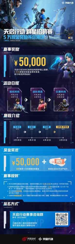 致各位星能者: 「群星招募赛」将于4月12日开启报名,报名时间至4月17日23:59截止。想要参加此次「群星招募赛」的星能者,可以通过填写游戏内报名问卷进行报名,或进入赛事咨询群(群号:263238003)进行赛事咨询。 本次比赛将由12支玩家战队和4 支特邀平台战队组成 16 支队伍,在4月20日-4月23日期间展开激烈角逐,冠军队伍将独享50000元群星初创基金,其余队伍也将瓜分万元严选卡奖励! 群星初现,该你闪耀!天启行动将为你们的热血电竞梦插上翅膀,期待各位的参与和精彩表现!