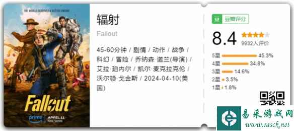 《辐射》真人剧集于本月10日正式上线,豆瓣评分现已解禁,目前为8.4分,五星好评率达45.3%。