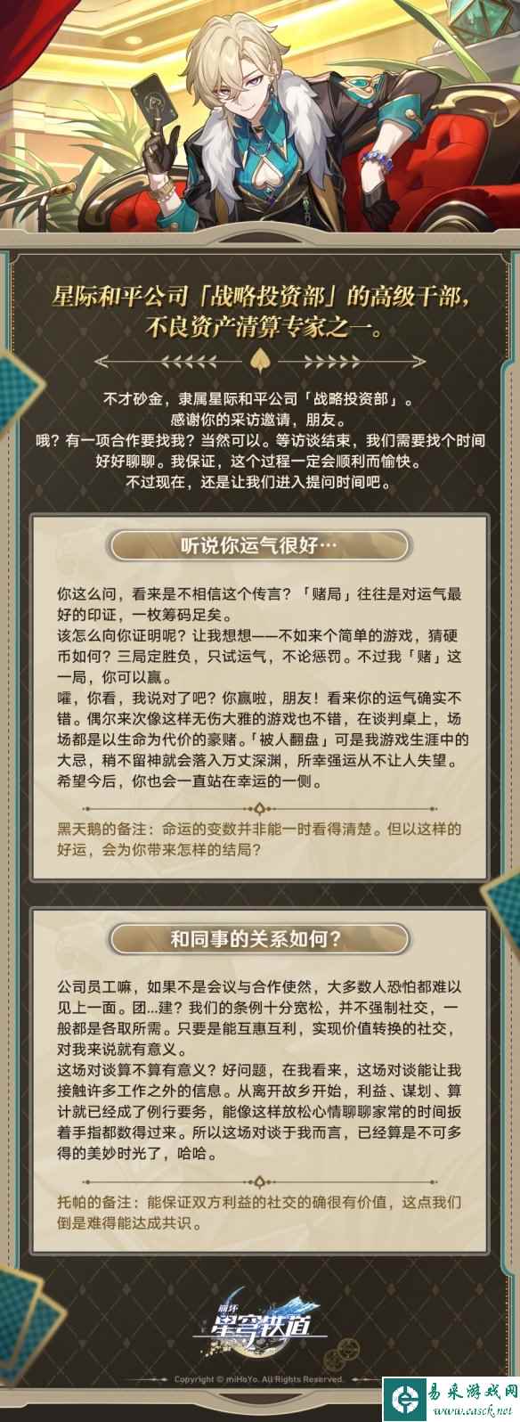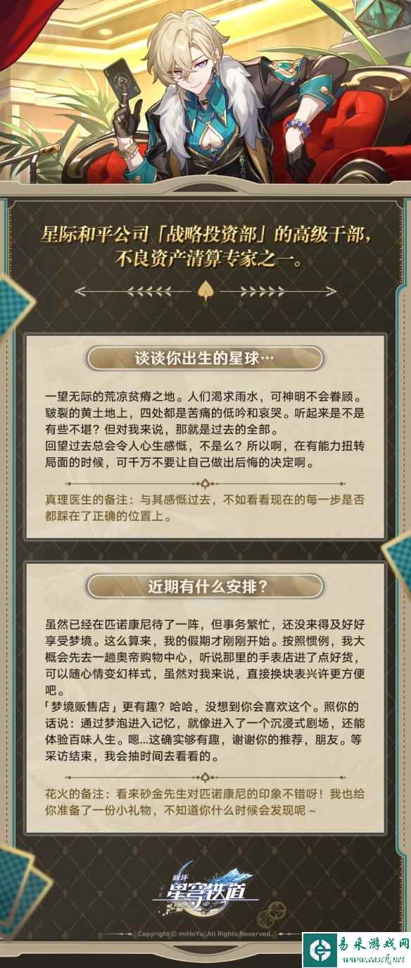 《崩坏:星穹铁道》2.1版本下半部分的内容将于明天(4月17日)正式上线,官方公开了即将加入卡池的新角色“砂金”的角色介绍。 砂金 不才砂金,隶属星际和平公司「战略投资部」。感谢你的采访邀请,朋友。 哦?有一项合作要找我?当然可以。等访谈结束,我们需要找个时间好好聊聊。我保证,这个过程一定会顺利而愉快。不过现在,还是让我们进入提问时间吧。