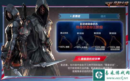 在暗影模式玩法中,玩家将分为“影舞者”与“佣兵”两大阵营。“影舞者”在仅能使用近战武器的限制条件下将拥有3种不同阶段的“隐身”效果作为平衡,玩家可以通过移动提高隐身阶段的阶段,降低自身透明度。