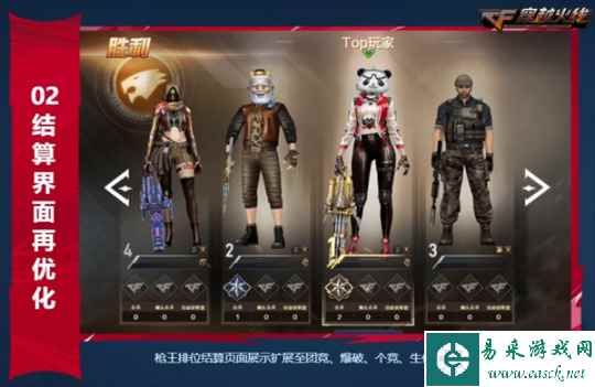 而在结算界面调整优化方面,本次版本更新则将枪王排位最新调整后的直观结算页面拓展至团队竞技模式、爆破模式、个人竞技模式及生化模式等多个普通模式中。通过更加具有观赏性的结算页面在不区分阵营的情况下展示局内TOP玩家的角色和战绩信息。