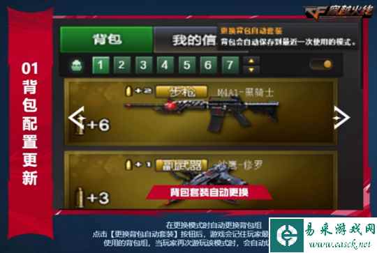 系统优化 背包配置一键记录更换 本次版本更新还有背包配置更新、结算界面优化及生化对局UI改善等系统优化内容为广大CFer提供更加舒适的游玩体验。版本更新后,CFer在背包页面将可以选择开启更换背包自动套装功能,开启后游戏将自动记录玩家最后一次游玩某模式时使用的背包组,后续再次游玩该模式时将自动切换至对应背包。而如果CFer对于更换的结果并不满意,也可以通过点击背包内的“复原”按钮切换回更换前的默认状态。
