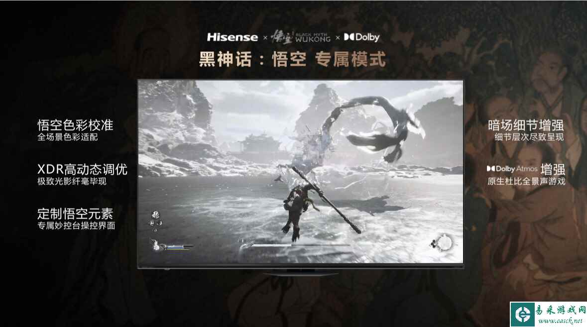 4月17日,在“AI美好生活”2024海信电视E8系列新品发布会上,海信电视官宣成为《黑神话:悟空》全球官方合作伙伴。同时,海信电视还为广大游戏玩家带来了《黑神话:悟空》的显示CP,推出了官方定制电视——旗舰新品海信电视E8N系列,以及官方合作显示器——海信显示器27G7K Pro。海信电视E8N系列更是带来了“黑神话:悟空专属模式”,以专业游戏影音解决方案带来全新的游戏场景体验。