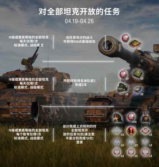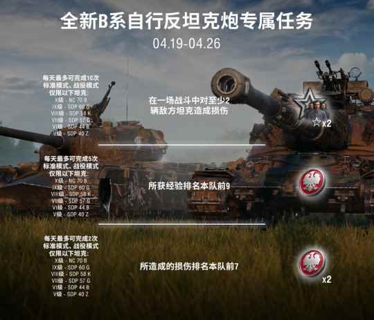 该活动将开放2套任务。完成这些任务,并收集白鹰令牌。使用该令牌还可兑换自选奖励,此外,军械库和特惠商城中也将上架包含令牌的特惠礼包! ·整个活动期间,系统将开放全新B系自行反坦克炮专属任务。每个任务每天可完成数次,完成任务即可获得白鹰令牌和额外乘员经验 ·活动每天还会推出开放给全部IV级或更高等级坦克的新任务。完成这些任务即可获得更多白鹰令牌、独特B系历史徽章,以及其他珍贵奖励 全新B系自行反坦克炮专属任务