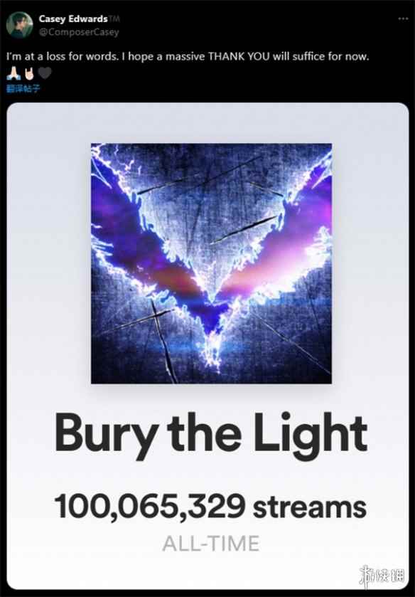 今日,《鬼泣5(Devil May Cry V)》作曲家Casey Edwards宣布,由他创作的维吉尔主题曲《Bury the Light》在Spotify上的播放量已经突破了1亿次,甚至超过了《鬼泣5》原本的主题曲《Devil Trigger》。 《Bury the Light》为《鬼泣5特别版》中新加入的曲目,在特别版游戏中,玩家将能操作维吉尔,同时该角色也是基础版游戏的可选DLC。该主题曲完美契合了玩家对维吉尔的认知:对力量的执着追求,和痛苦经历的悲伤迷惘,这两者的微妙结合。 |