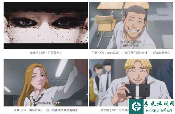 主要角色包括: - 柳皓彬(CV:丹羽哲士) - 巴哥(CV:武内骏辅),有70万订阅的直播主,经常欺负皓彬 - 璐美(CV:青山吉能),刚开始直播的美妆直播主 - 禹志赫(CV:冈本信彦),外号黑手,负责摄影 - 朴智贤(CV:本名阳子),皓彬的母亲,长期住院 - 崔宝薇(CV:石川由依),皓彬打工快餐店的女神 - 金文城(CV:中村悠一) - 斗鸡(CV:杉田智和),完全没人看的外国口音影片制作者 - 秋天(CV:菲鲁兹・蓝)