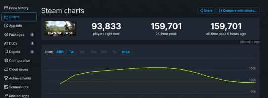 在线率方面,据SteamDB,《庄园领主》当前在线9.4万人,24小时峰值接近16万(159701)人同时在线。随着周末的到来,相信同时在线峰值还会继续上升。 这个数字可能也在大家的意料之内,毕竟早在发售前夕,已有320万人将《庄园领主》添加到了Steam愿望单。相比其他大作,这款单人开发的独立游戏有着这样的现象级表现已经很不错了。