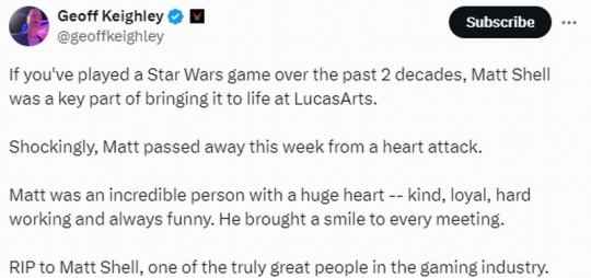 近日知名游戏媒体人杰夫·基利(Geoff Keighley)发推文称,LucasArts前负责人马特·谢尔(Matt Shell)因心脏病去世。